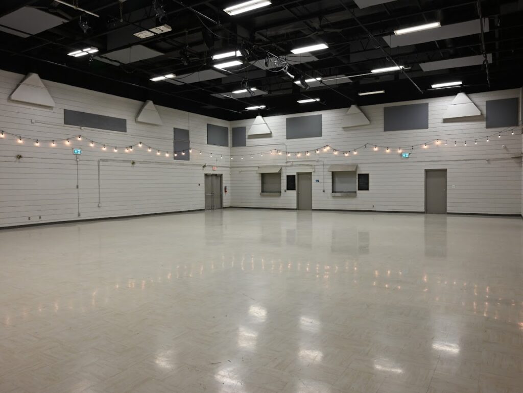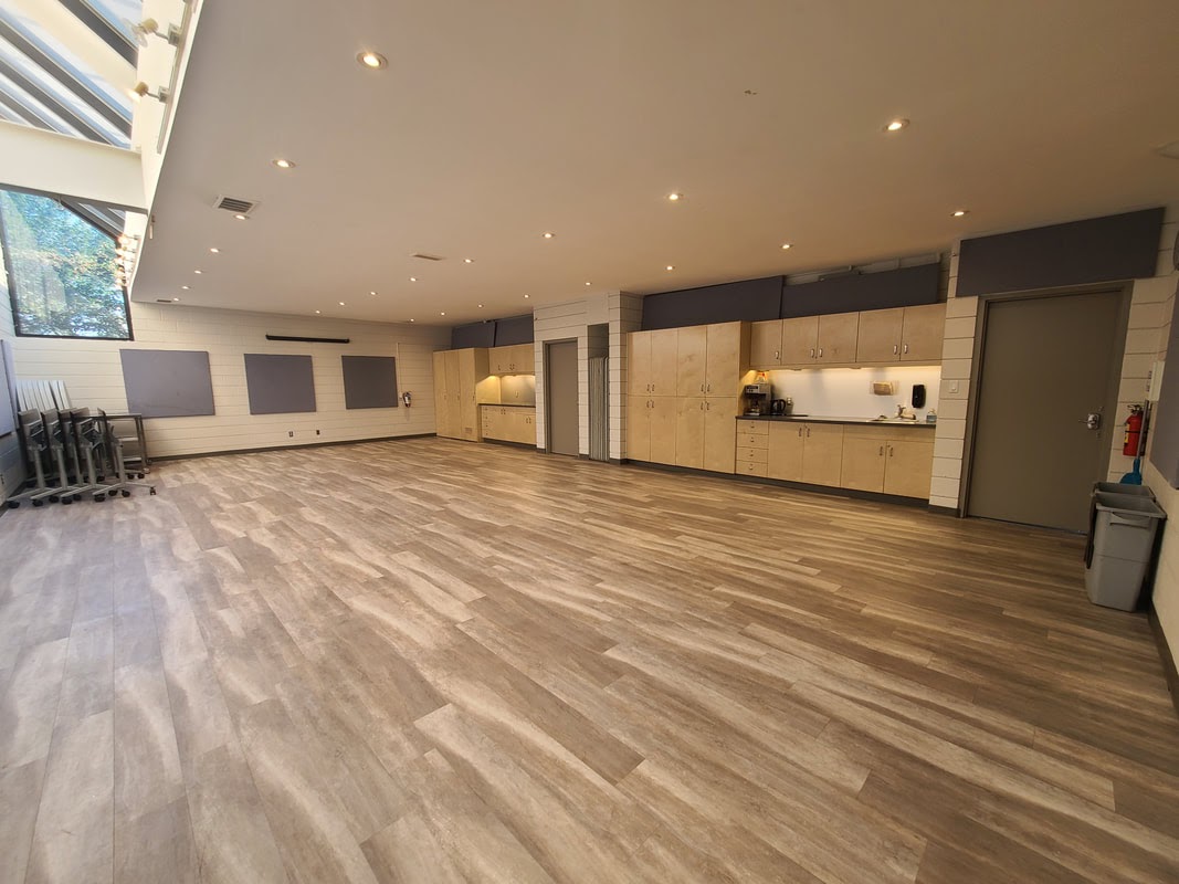 A large 3500 sq ft hall (52 by 68 feet with 20 foot high ceilings) with commercial kitchen, bar and reception /coat check. Loading doors open onto bricked west patio. Great for weddings, conferences, concerts, trade shows, performances and more.