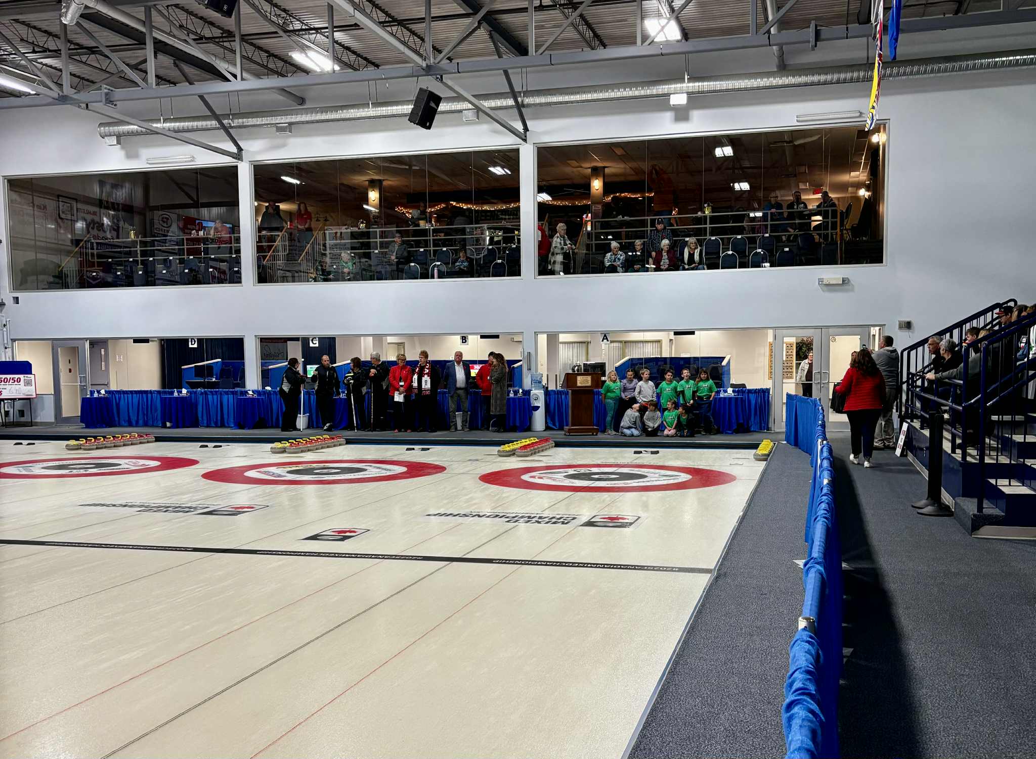 The curling club is a very spacious four sheet facility which opened in November 2001. It comes with enough seating for approximately one thousand viewers. There is seating along sheet one for approximately seven hundred spectators, while the main level lobby and lounge make room for another 300 viewers.