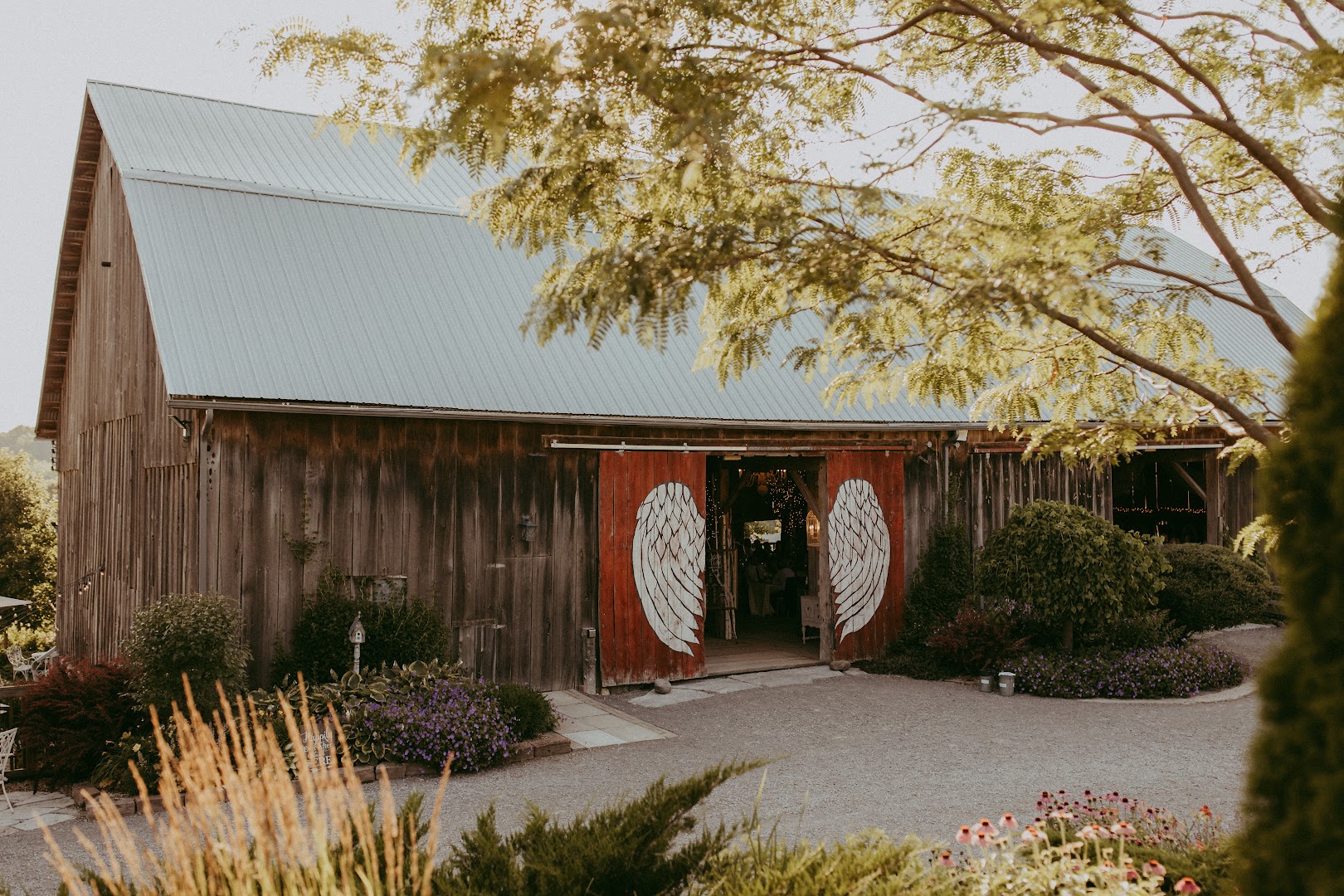 The 100-year-old architecture features original beams and a soaring ceiling with chandeliers for lighting up any event or party atmosphere you want to create. Gorgeous chandeliers, twinkle lights, and natural elements add sparkle to every corner of the space and accentuate the historic charm and beauty of the barn.