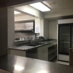 Large kitchen equipped with a upright fridge (without freezer), stove, microwave, stainless steel counter & 2 double sinks back to back, 3-shelf trolley