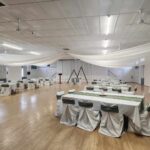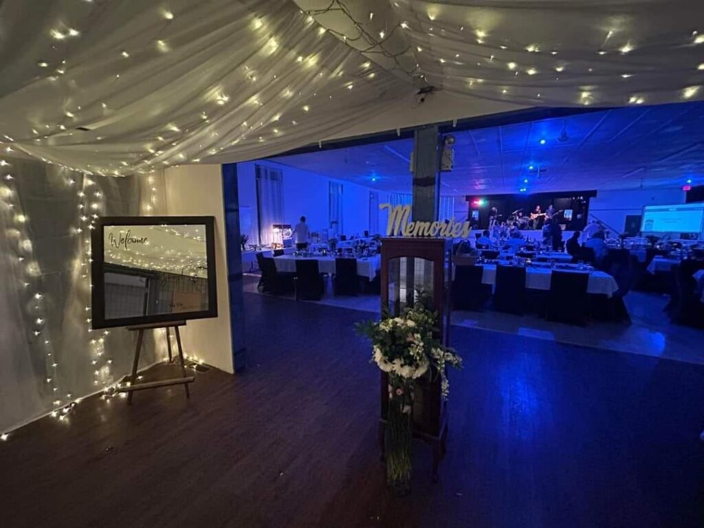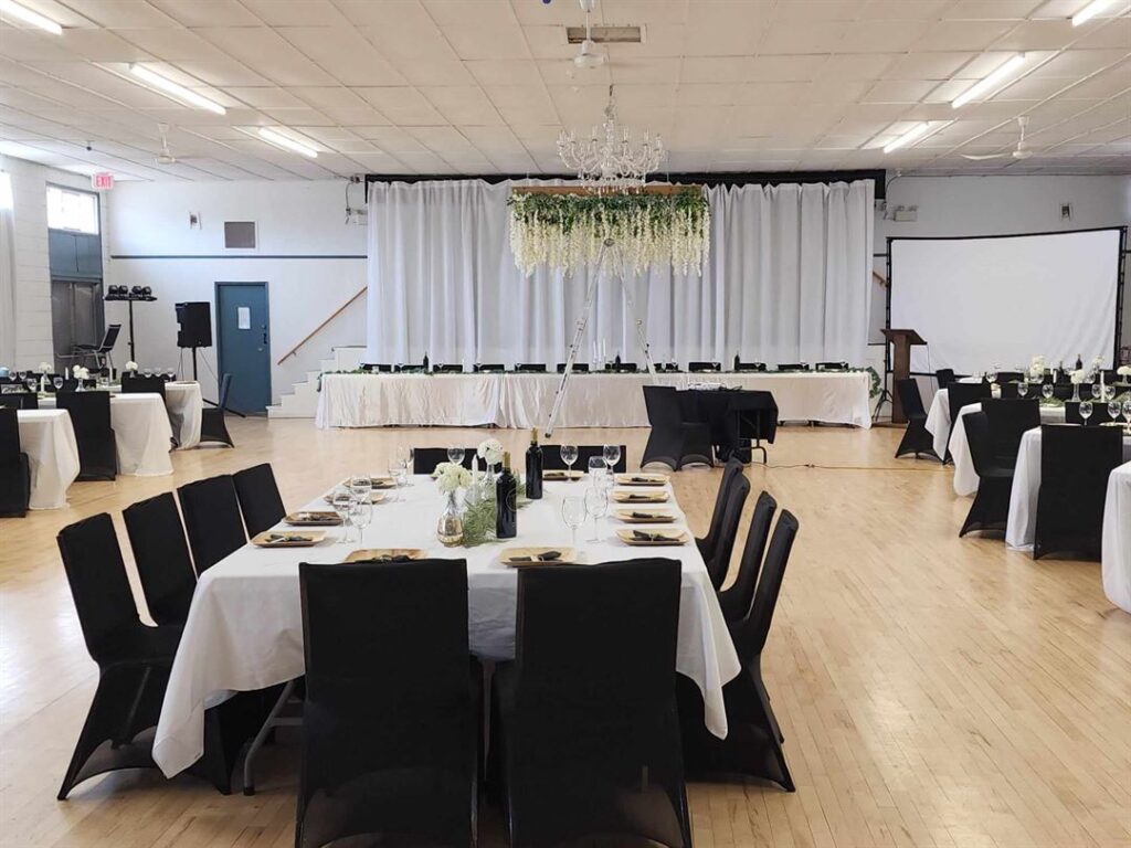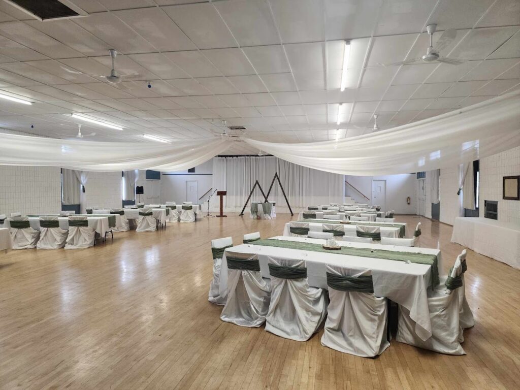 Ideal for meetings, weddings, anniversaries, potlucks, dances. Full kitchen/bar, 3 stoves, fridge, cooler, microwave, 3 sinks. 3400 sq ft maple dance floor, stage, seats 300. 30 tables/chairs incl. Ample parking, bus route.