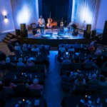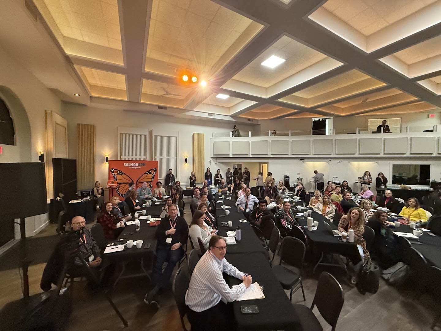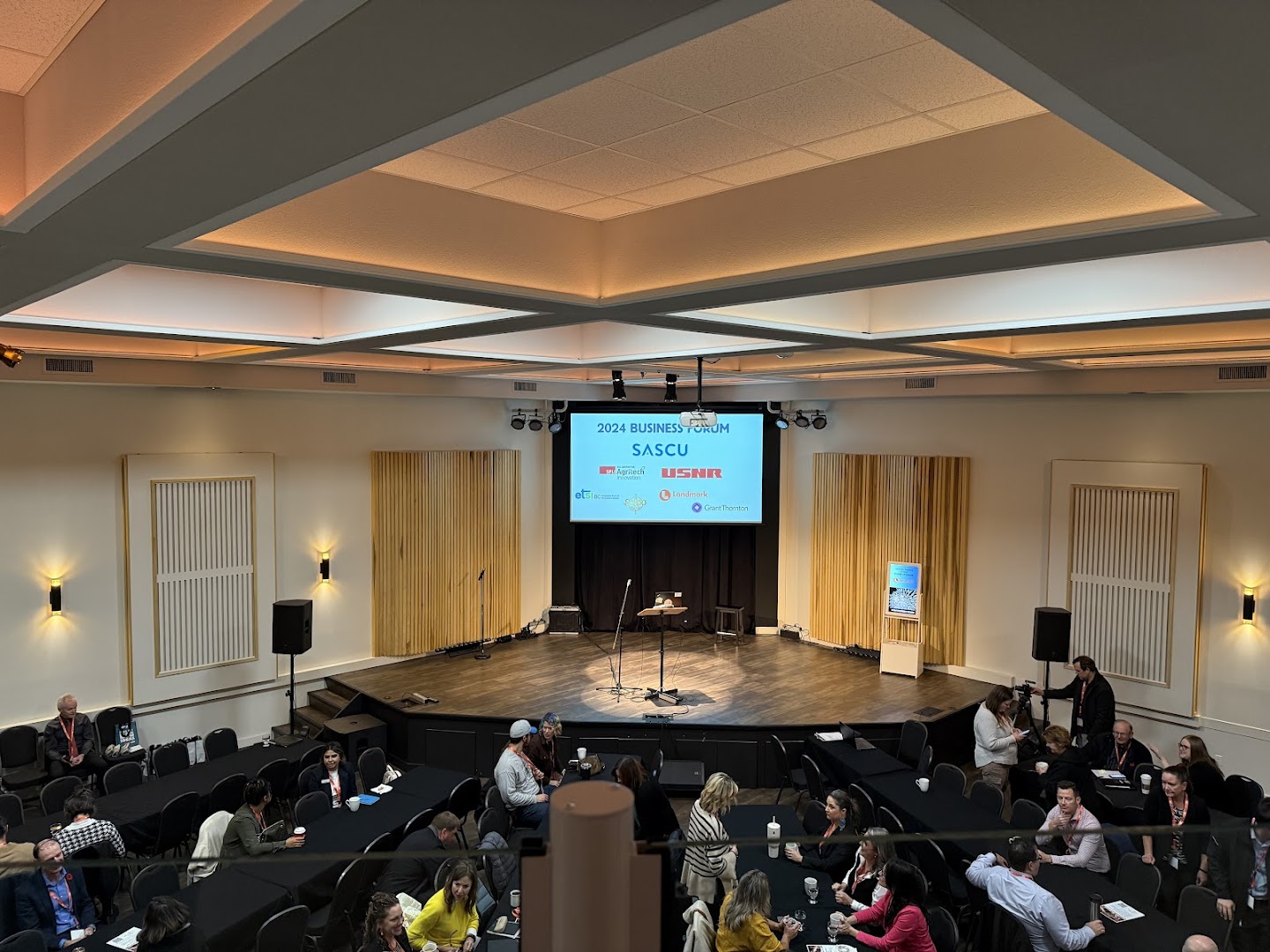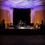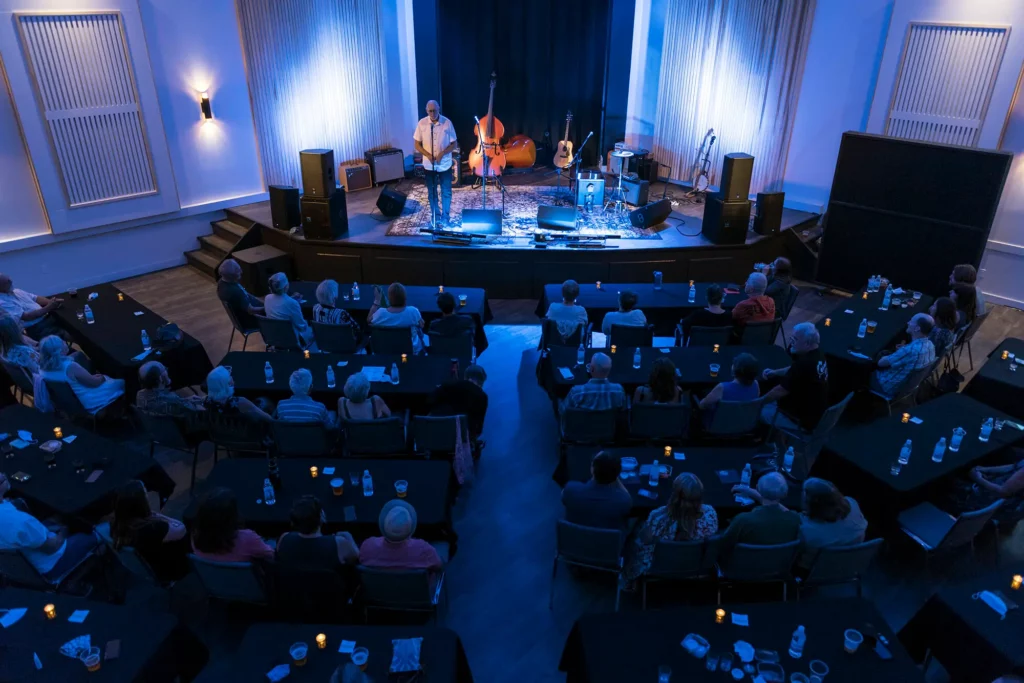The Main Hall has a capacity of 235 persons with 200 soft black banquet chairs, a large corner stage, balcony with VIP seating, This space is suitable for concerts, dances, small theatre shows, comedy, fundraisers, galas, corporate events, meetings, workshops, private events, celebrations of life, and weddings. Main hall bookings include use of the kitchen, bar, and lobby.