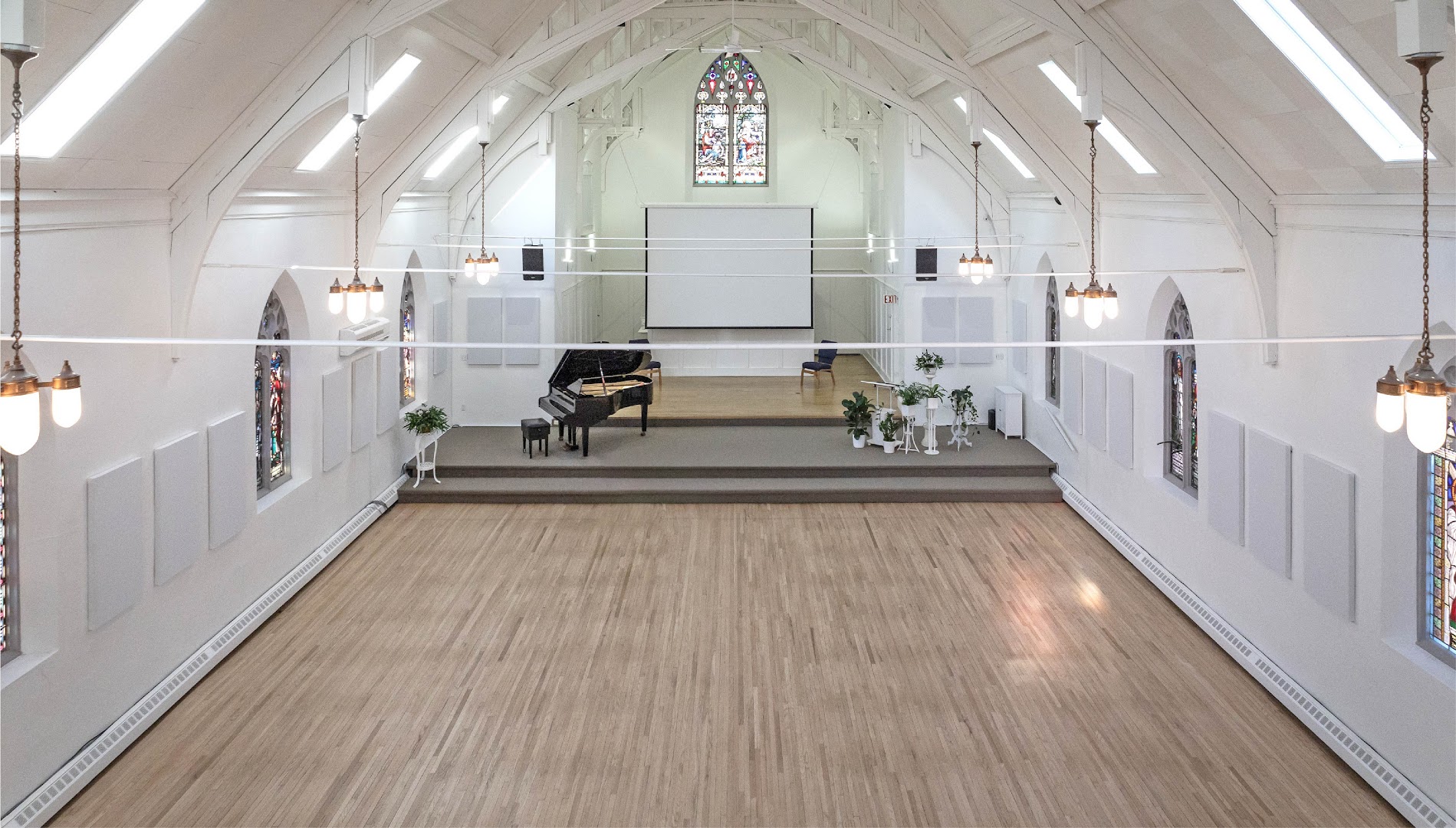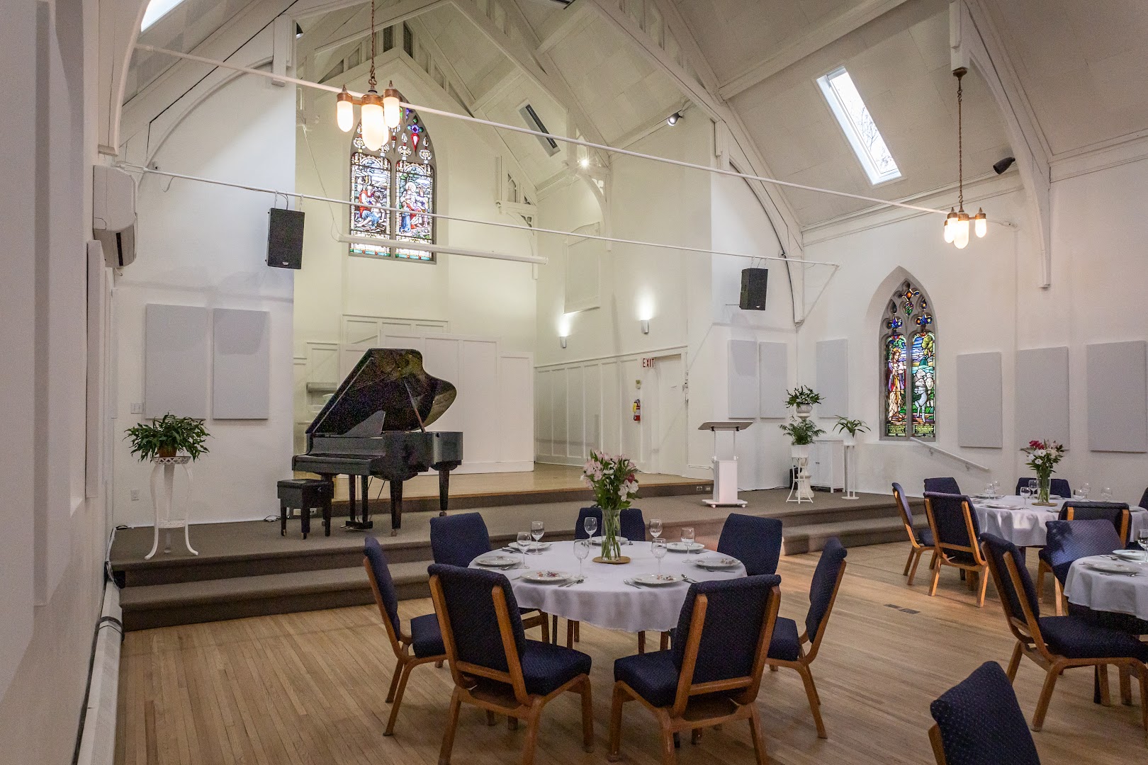 Performance-level audio and visual setup, with live-streaming for remote guests and projection capabilities.