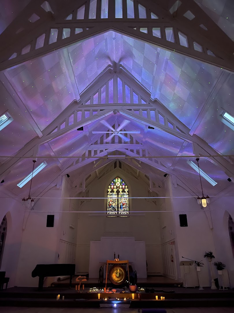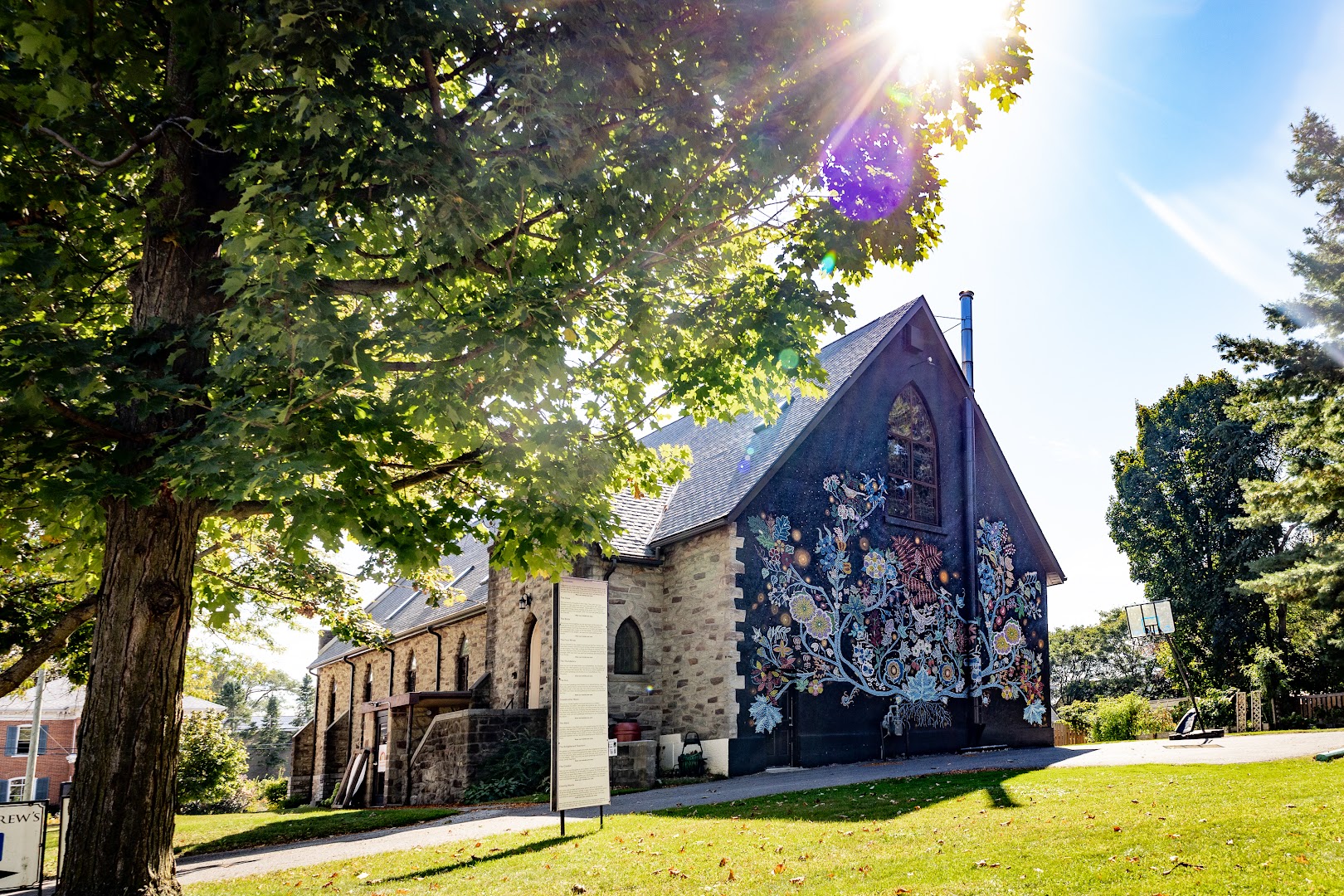 A peaceful outdoor space with a labyrinth, mural, and gardens.