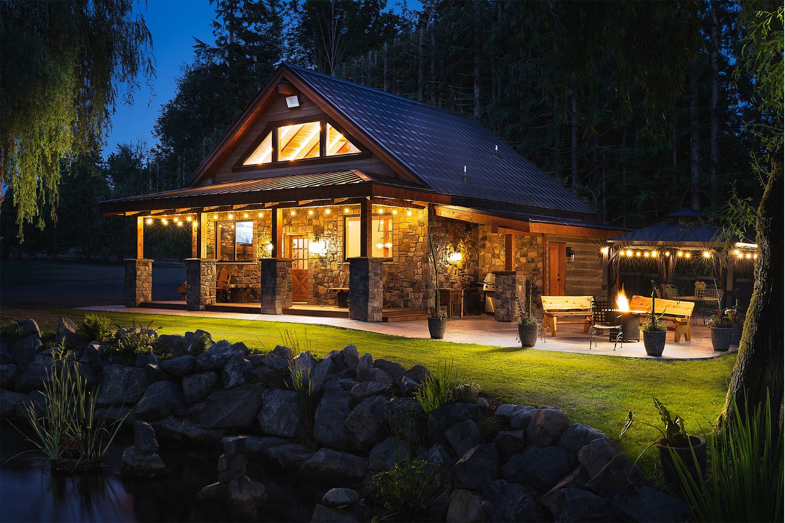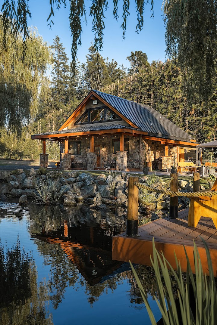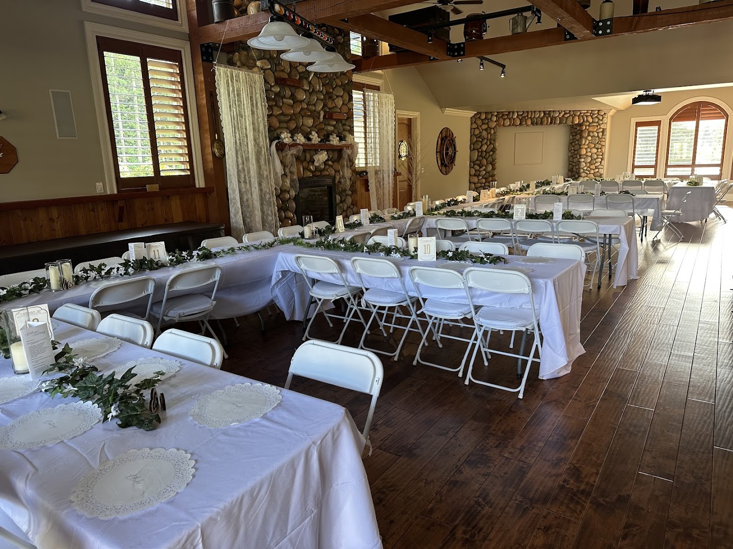 Step into a venue thoughtfully crafted to bring your wedding vision to life. The rustic-elegant hall welcomes you with a grand, inviting entrance and a breathtaking floor-to-ceiling fireplace that sets a warm, romantic tone for your day. Beyond the hall, three beautiful doors open onto a covered outdoor patio.